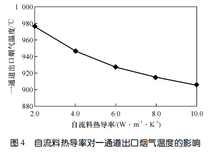 SiC 自流料熱導(dǎo)率對(duì)一通道出口煙氣溫度的影響圖4示出了自流料熱導(dǎo)率對(duì)一通道出口煙氣溫度的影響。可以看出,爐襯各工作層厚度固定時(shí),一通道出口煙氣溫度隨自流料熱導(dǎo)率的升高而降低。通過(guò)調(diào)整自流料熱導(dǎo)率,一通道出口煙氣溫度差值高達(dá) 70 ℃。
